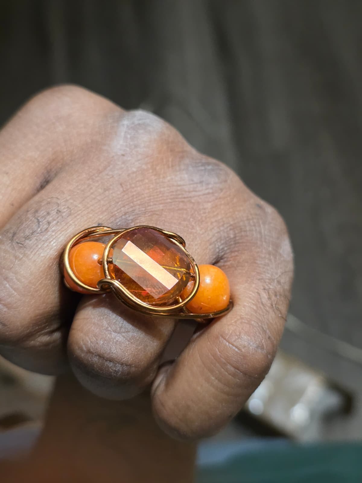 Central Focal Stone: A large, faceted orange/amber gemstone   “caged” at the center of the setting.