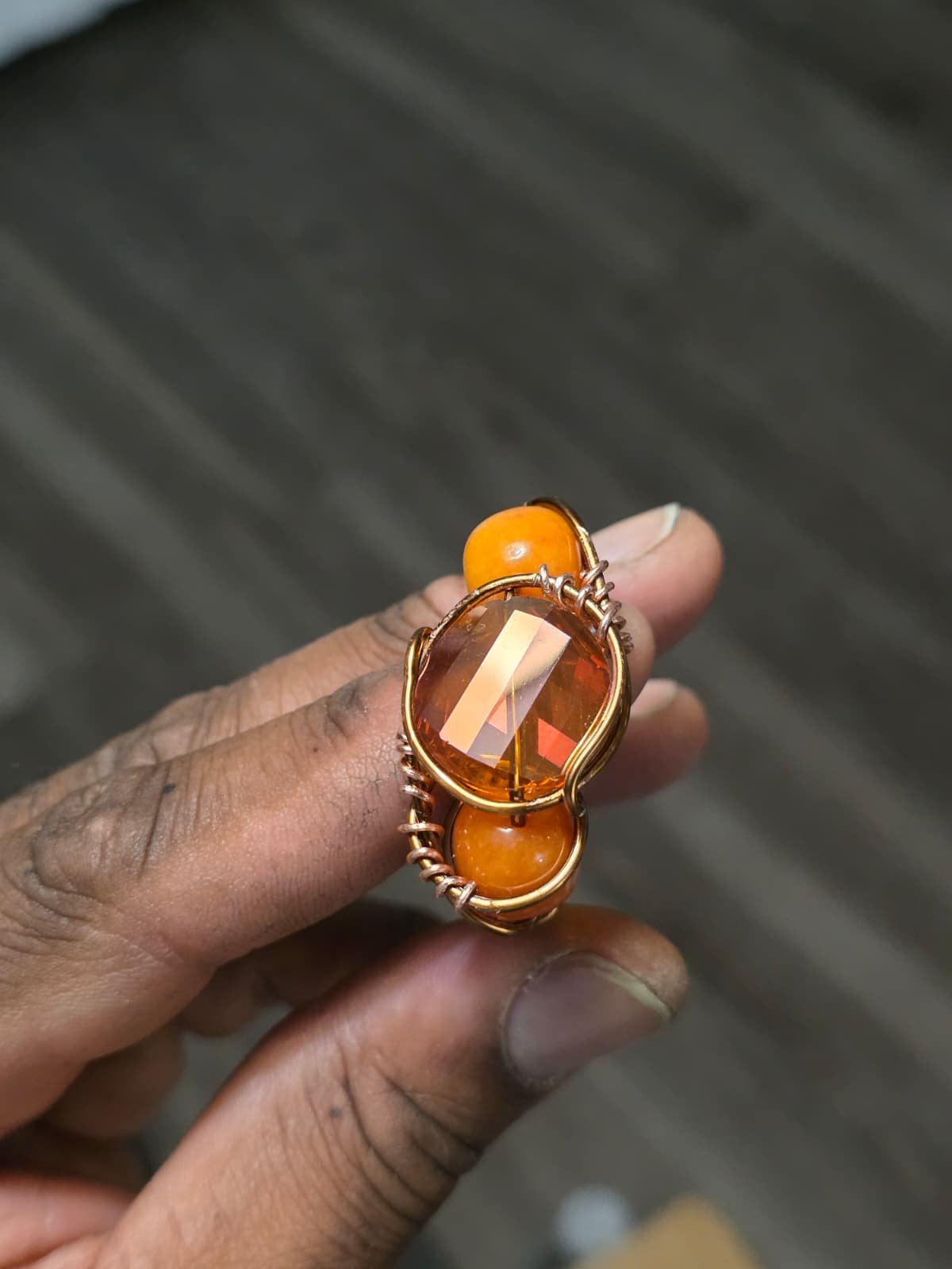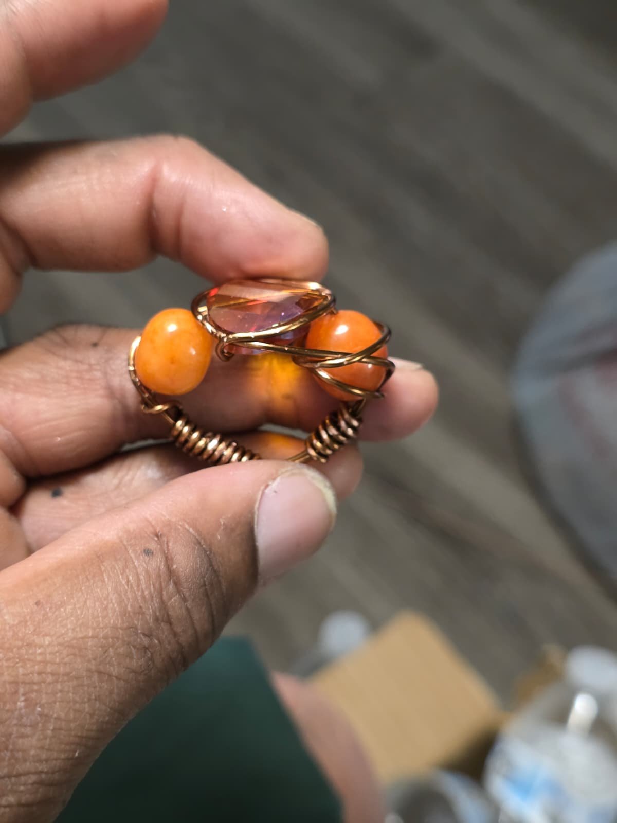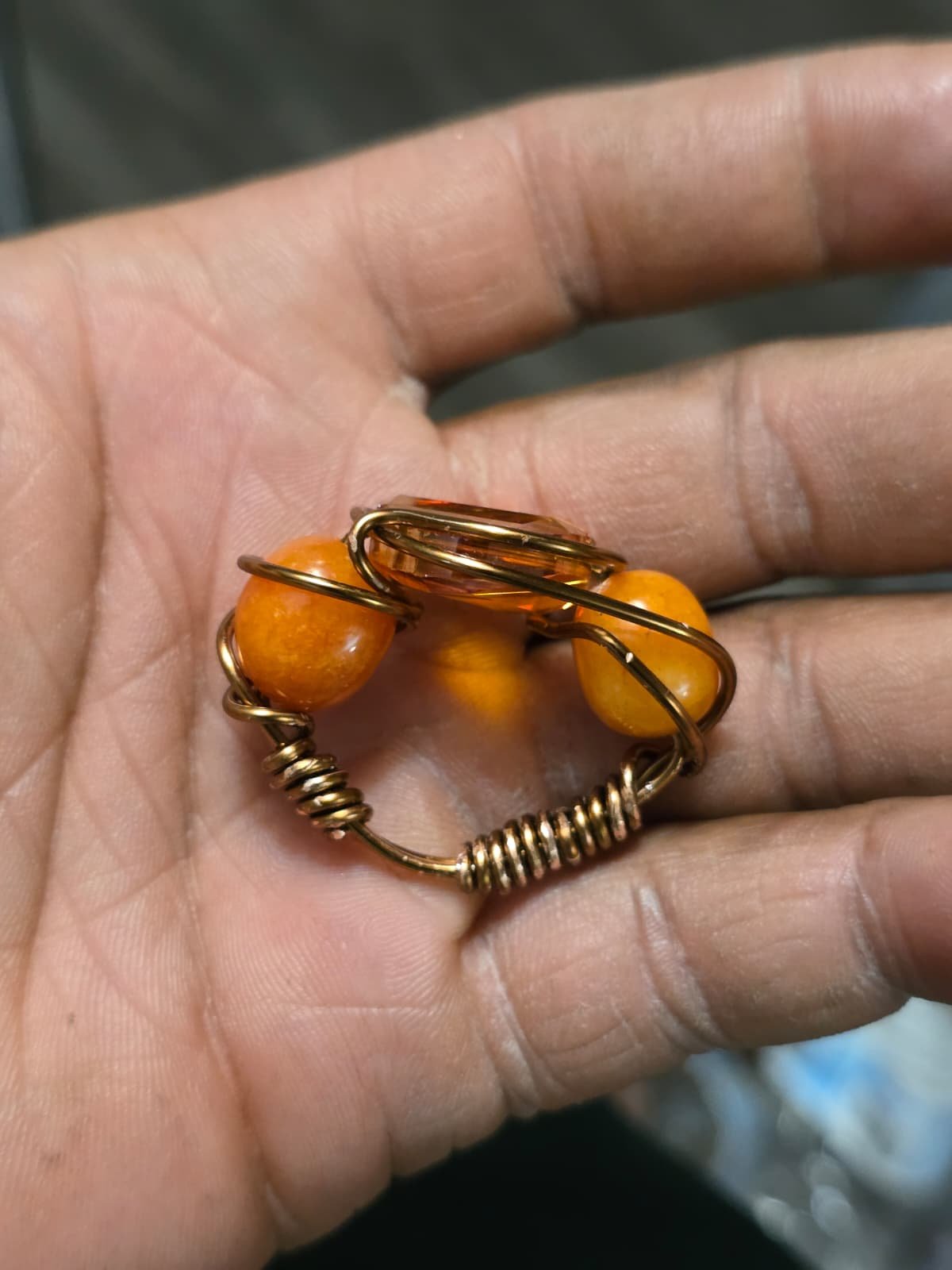 • Wirework Structure: The entire piece is constructed from heavy-gauge copper wire. The band is made of several parallel strands, while the top of the ring features intricate coiling and weaving to secure the undrilled stones.