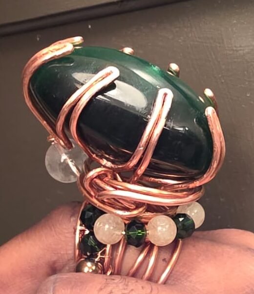 - Structural Framework: The entire piece is built from heavy-gauge copper wire. The band consists of multiple parallel wires, while the setting features intricate “caging” that secures the undrilled main stone without the use of glue.