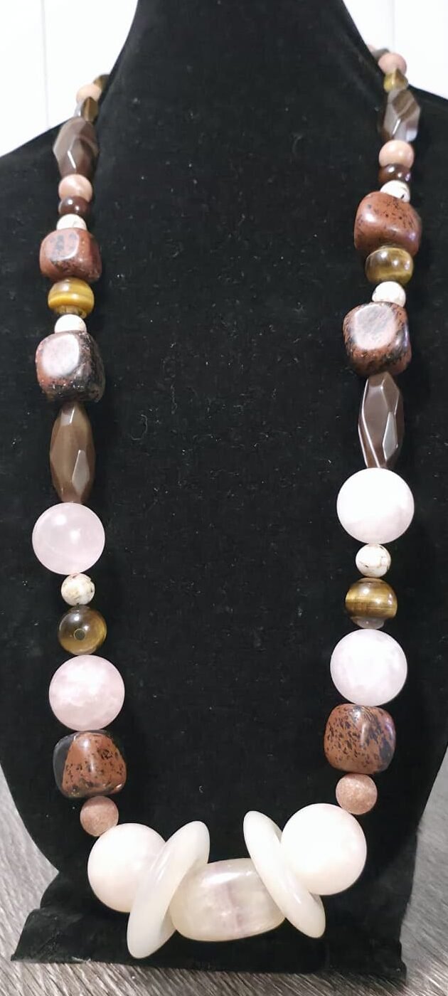 This chunky beaded stone necklace is a bold statement piece crafted from an eclectic mix of natural gemstones in earth tones and soft pinks. Its design features a graduated style, where the beads progressively increase in size toward the center, naturally drawing attention to the focal point.