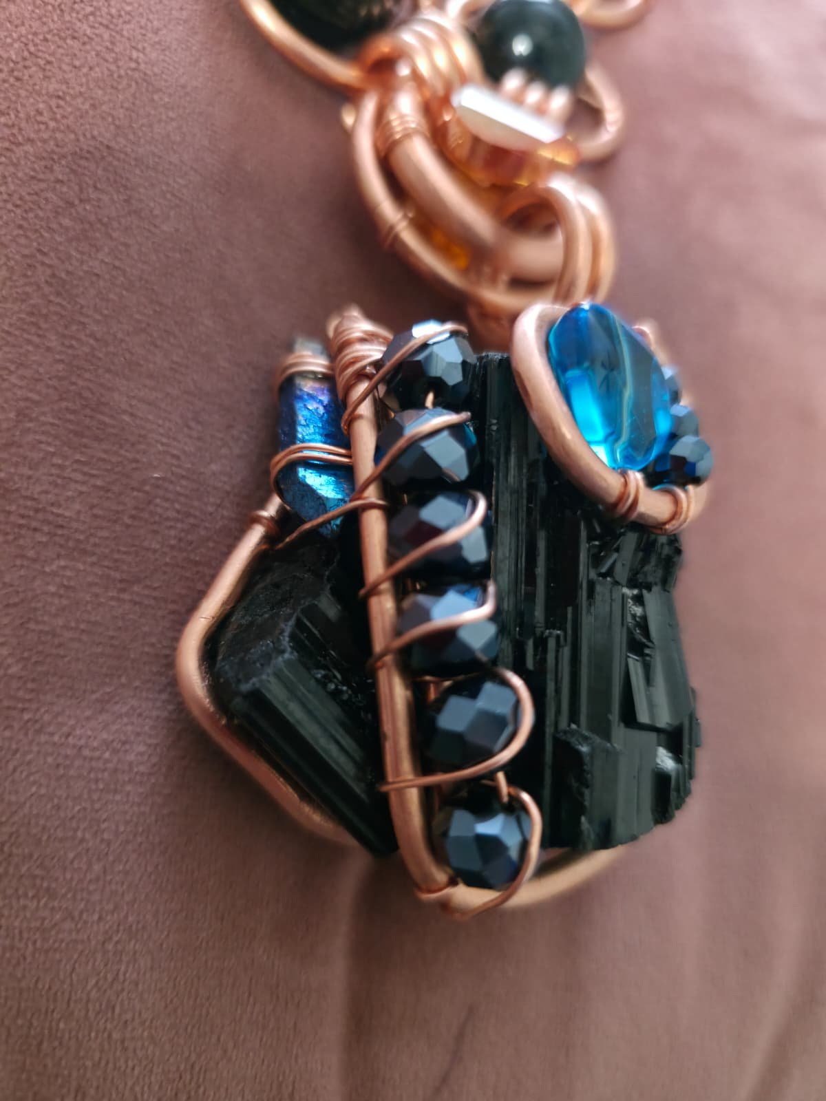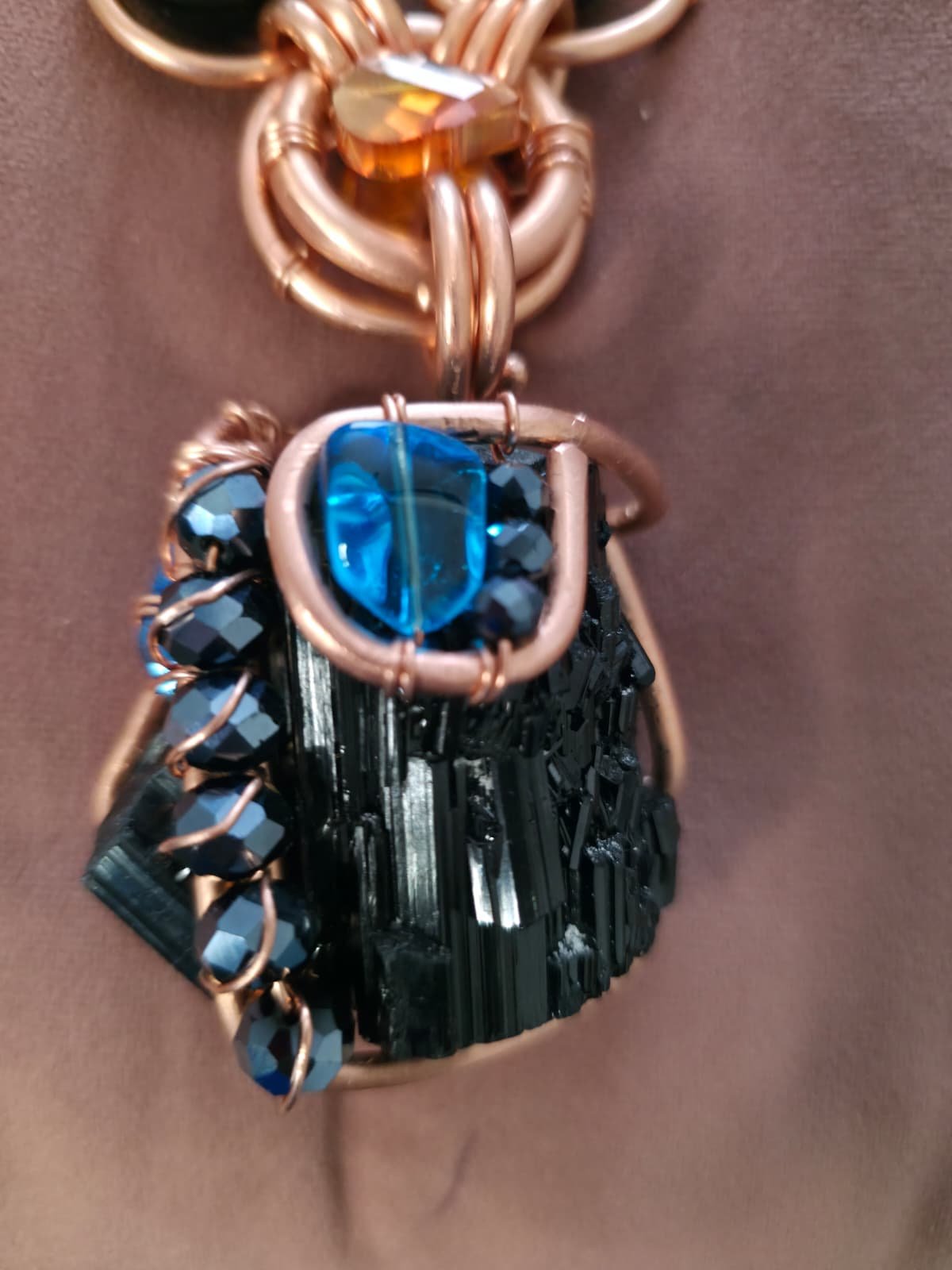 - Deep-Sea & Sunset Accents: The brooding tourmaline is punctuated by a high-contrast array of cobalt blue crystals and honey-amber spheres. This “Ocean-meets-Earth” palette creates a visual rhythm that is both regal and rugged.
